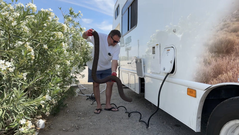 Opróżnianie odbywa się poprzez podłączenie węża do specjalnego punktu zrzutu — tzw. dump station. To rozwiązanie na początku może wydawać się nietypowe, ale jest bardzo wygodne, szczególnie podczas dłuższych podróży. Bo np. o ile kasetę toalety chemicznej musisz opróżniać codziennie jeżdżąc po Europie, to taki zbiornik w US możesz opróżniać co kilka dni.