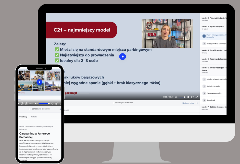 Platforma działa zarówno w przeglądarce na komputerze, jak i w telefonie. Dodatkowo dostępna jest wygodna aplikacja mobilna, dzięki której możesz mieć materiały zawsze pod ręką. Nawet już podczas podróży kamperem w USA.
