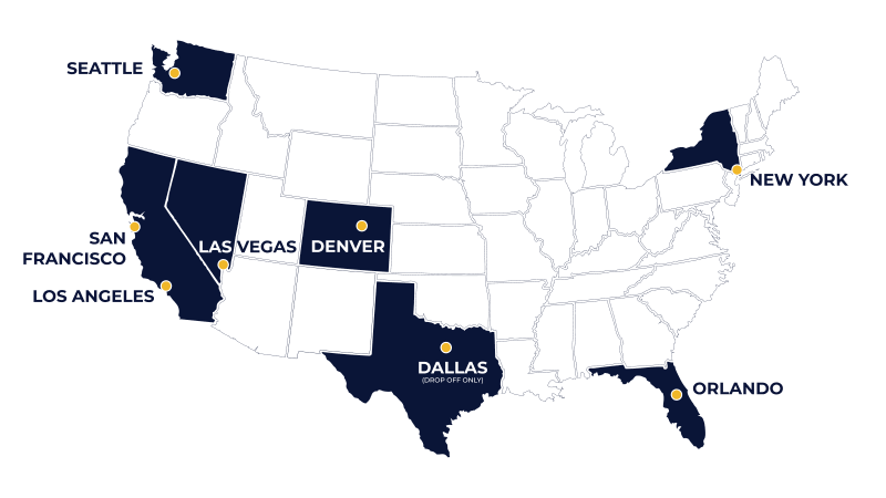 Jest 7 punktów w których możesz wynająć kampery Road Bear na terenie Stanów Zjednoczonych. Plus jeden dodatkowy punkt, w Dallas, w który można tylko oddać kampera w opcji one-way.